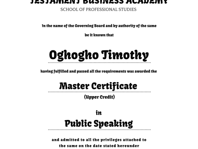 I have over three (3) years of cognate experience in speaking engagements, events and public speaking training, life coaching and communications science. I am a certified Life Coach from Life Coach Training Institute (USA), earned a Master Certificate in Public Speaking from Testament Business Academy (TEBA) with over four (4) years of teaching experience.